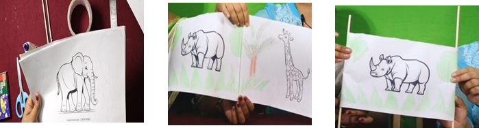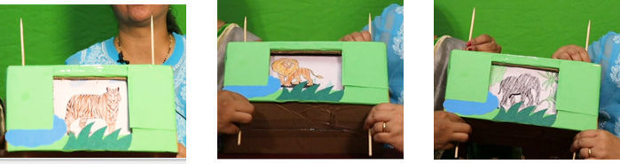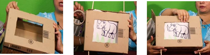 • Take the paper reel (with animal drawings) pasted on the sticks and insert it inside the box so that the images appear clearly through the frame window.