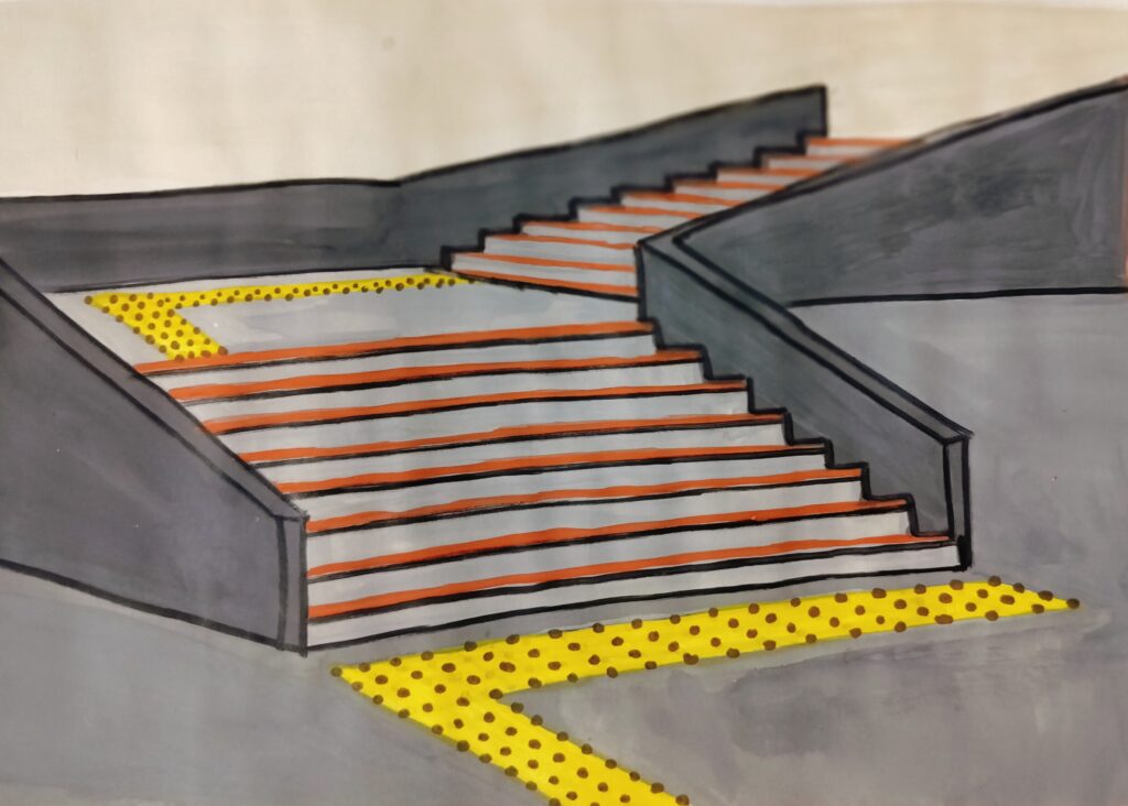 Colour/tonal contrast should be considered for both the front edges of the steps and the handrails, as well as tactile warning pavers used before the step edges.