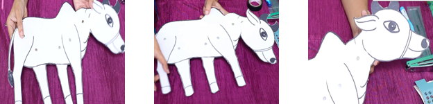 - Begin by drawing the different parts of the cow separately on the chart paper – the head, body, legs and tail. This helps in assembling the puppet with movable joints later. This is a rod puppet.