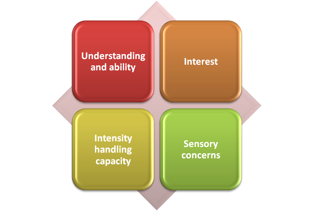 - Sensory concerns: Some CWSN are especially sensitive to loud noise, heat, strong smells, and bright lights. In such cases the child should avoid activities that involve sensory assaults. For example a child with light sensitivity may not be able to handle spotlights on a stage. In case the child is keen on these activities, then appropriate equipment that helps the child (like glasses, noise cancelling earmuffs etc) should be provided.