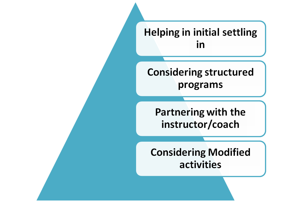 - Partner with the instructor/coach: Parents should make sure that the instructor is aware of the child’s strengths and challenges. They should assist the instructor to provide the accommodations needed for the child or handle the child in case of a meltdown.