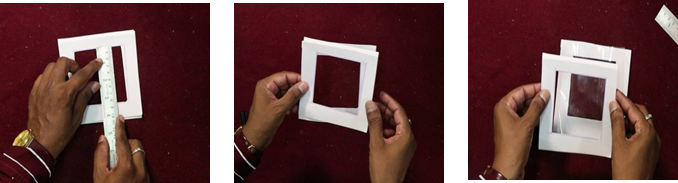 - Cut 2 nos. of square frames from white cardstock (outer square ~12x12cm, inner cutout ~8×8 cm).