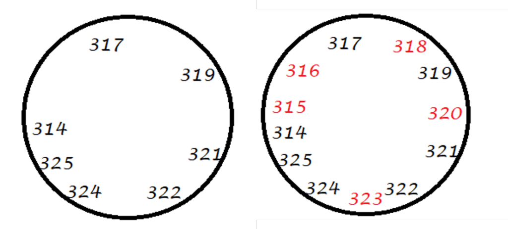 1. The teacher selects 7 children from the class. Each child is given a random number card from the sequence 314 to 325. Example cards: 314, 317, 319, 321, 322, 324, and 325.