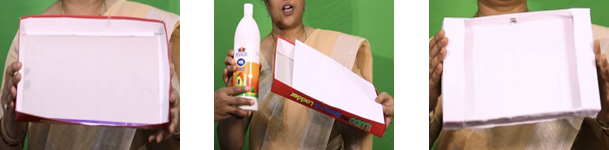 • Take either the lid or bottom portion of an old cardboard box. Paste and cover the entire portion of the box with white paper, using fevicol.