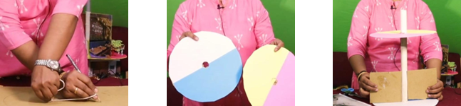 • Make a circle on cardboard, using a thread or a compass. Tie the thread around the thumb, hold the rest of the thread with the other hand along with a pencil. Move the pencil, making sure the thread is stretched tight and draw a circle of any radius. Teachers can also use compasses for smaller circles, to make a hole in the centre of the circle.