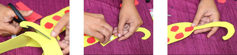 - Fold each strip in half and cut a V shaped slit in the bottom to form the cheetah’s claws/paws. Also make a small slit on the top for inserting the body. Staple the edges and use glue drops for reinforcing the legs.