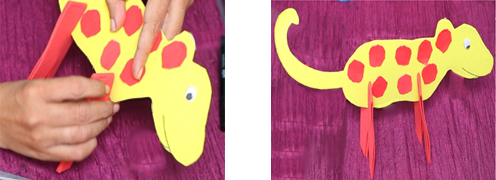 - Attach the folded red foam leg pieces to the bottom of the cheetah body to help it stand.